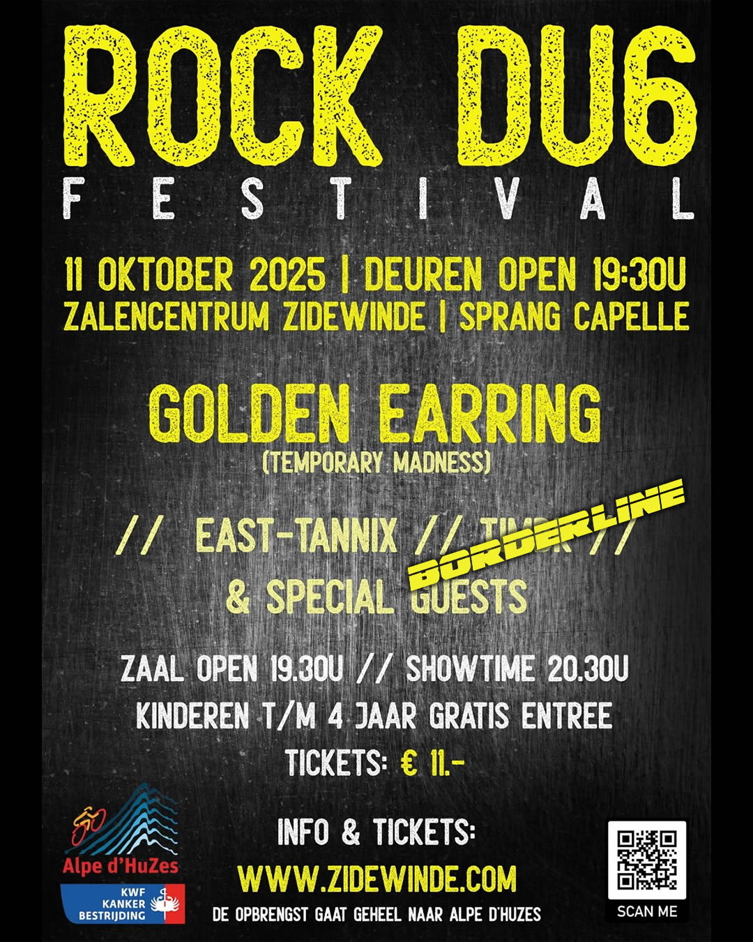 Met onze lange zomerstop achter ons is daar de eerste knaller van een binnenkomer dit najaar. Wij zullen, ter vervanging van de band TIMBR, opwachting maken op het Rock du 6 festival in Sprang Capelle. Wij sluiten deze avond in stijl af. Volledig belangeloos zullen wij het goede doel steunen. Samen met alle aanwezigen gaan we er een vette party van maken. De gehele opbrengst van deze avond gaat naar Alpe D'Huzes. Zien we jullie daar?